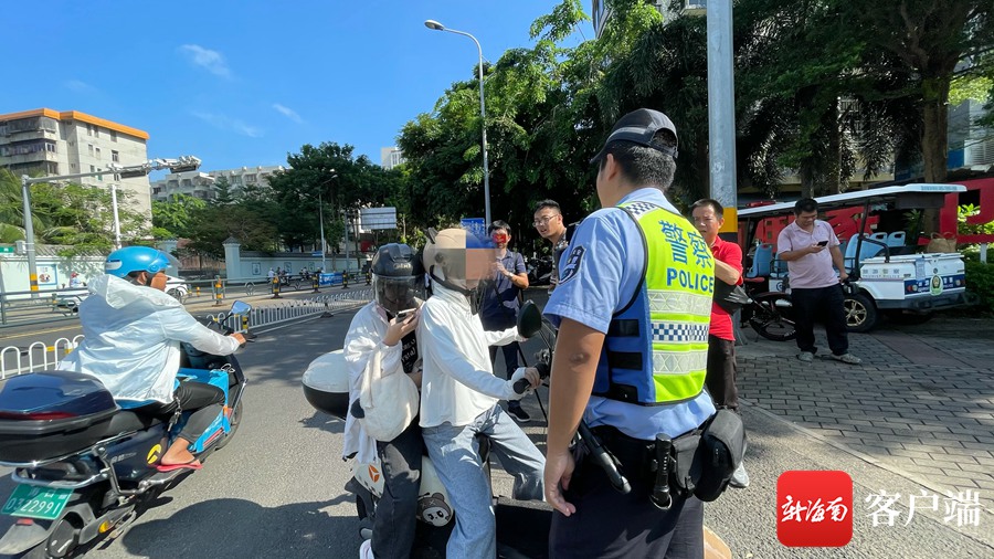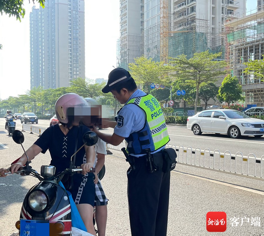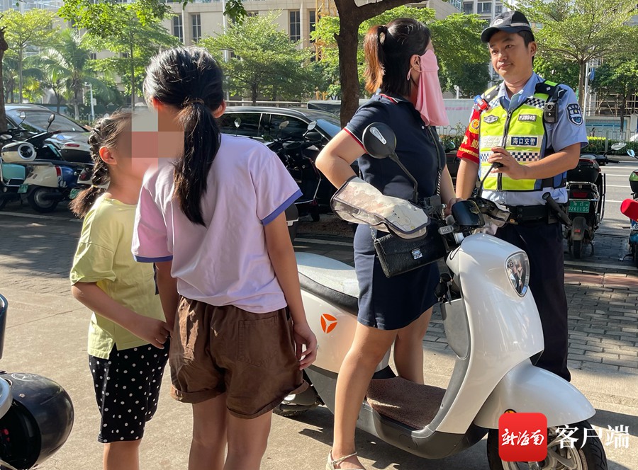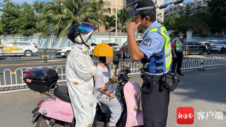 8月31日是海口中小学、幼儿园的开学报到日,当天许多家长骑车载着孩子去学校报到。当日8时许,记者在海口市兴丹路与红城湖延长线交叉路口的整治点,执勤民警先后查处了一些骑车存在逆行、不戴头盔、超员驾驶等违法行为的家长。“您这样太危险了!骑车接打电话会影响正常驾驶,存在很大安全隐患。”当看到一位妈妈骑车载着孩子经过红绿灯路口,因为接打电话,电动车突然失控差点摔倒时,执勤交警立即上前提醒对方注意安全,并给该家长普及了交通安全知识。