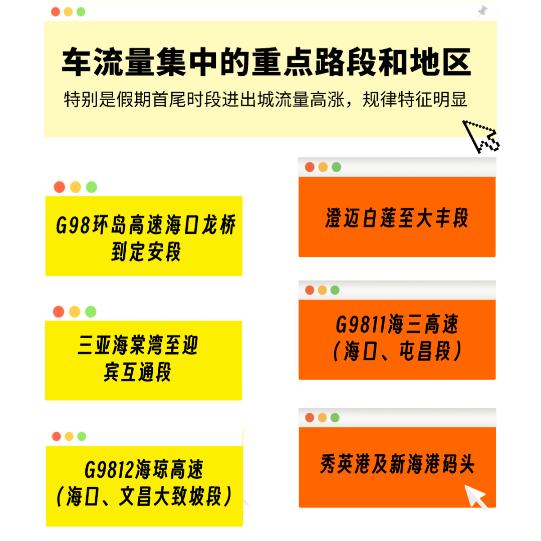预计9月30日至10月4日,每日的10时—12时、17时—20时。G98环岛高速东线海口至定安路段(海口往定安方向)、G98环岛高速西线大丰路段(海口往澄迈方向)、G98环岛高速东线万宁日月湾互通段(万宁至陵水路段双向)、G98环岛高速三亚绕城段(双向)将处于交通量高峰时段。