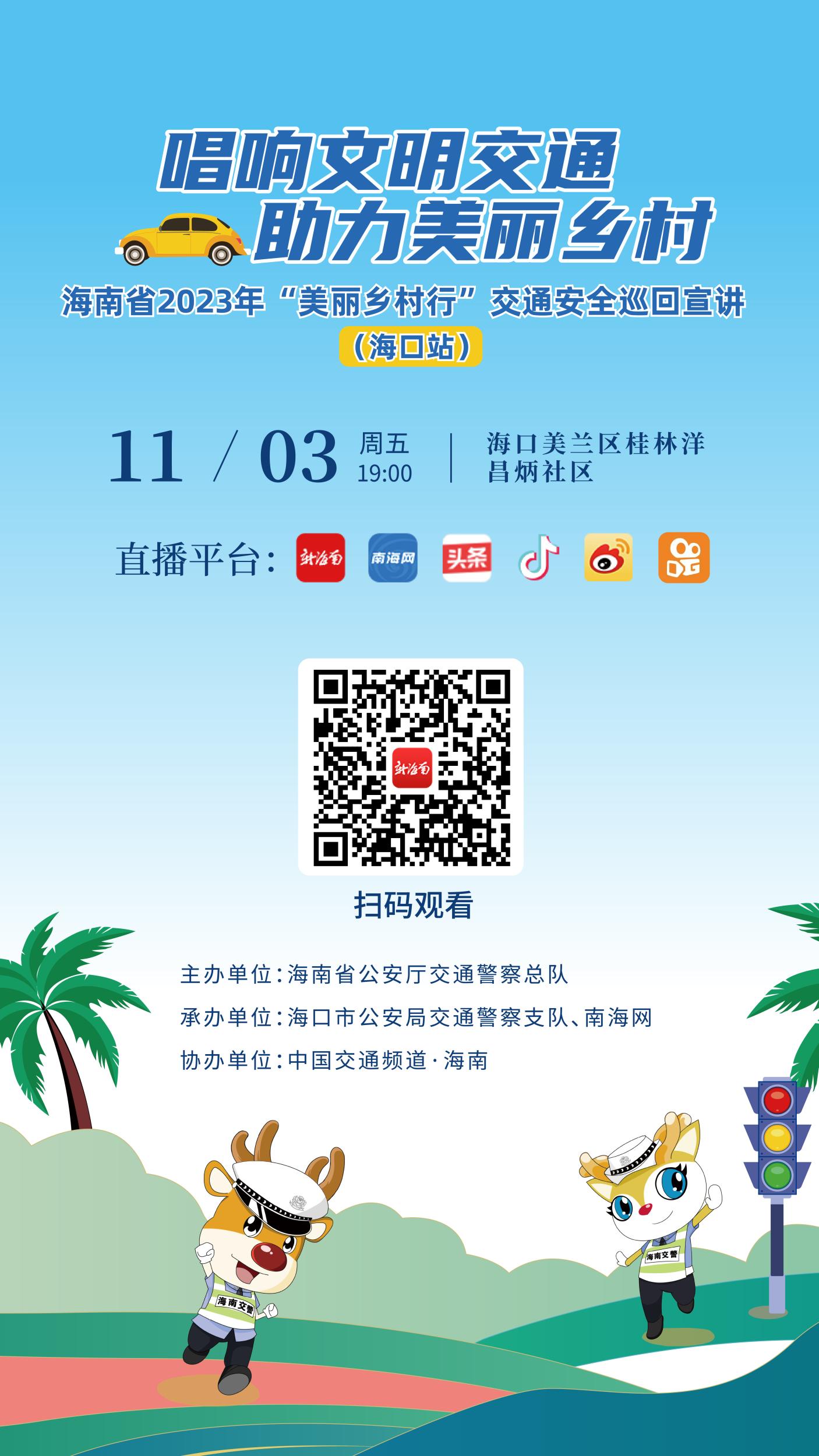 新海南客户端、南海网11月3日消息(记者 姚皓)11月3日19:00-20:30,“唱响文明交通 助力美丽乡村”海南省2023年“美丽乡村行”交通安全巡回宣讲活动首站,将走进海口市美兰区桂林洋昌炳社区,届时,一系列丰富多彩的活动内容将与大家热闹相约。新海南客户端、南海网、南国都市报旗下App、视频号、抖音号、微博、头条、快手将全程直播,敬请期待。