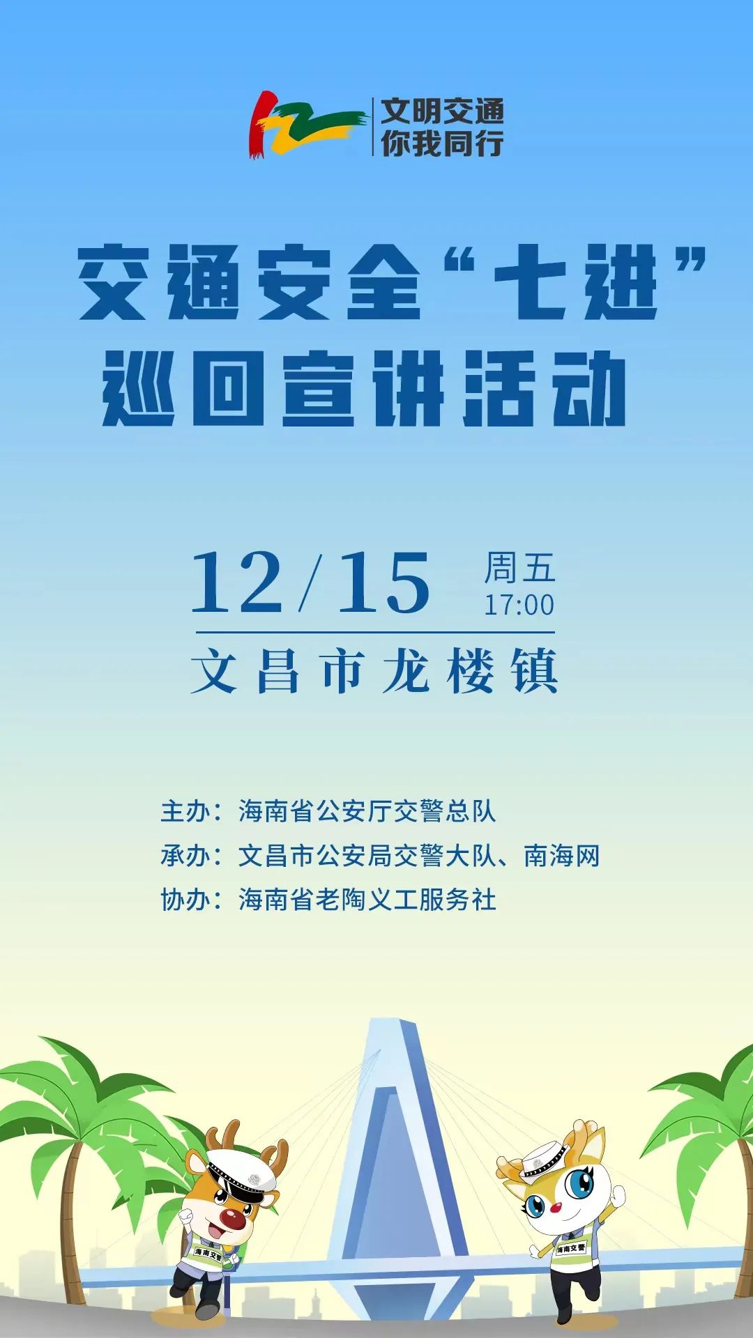为进一步提高广大人民群众的交通安全守法意识,营造全社会共同关注交通安全的浓厚氛围,12月15日下午17:00,海南交警联合南海网举办“海南交警交通安全‘七进’巡回宣讲活动(文昌龙楼站)”交通安全宣传活动,会为参与活动的朋友们准备丰厚的奖品,一定要记得来哦~