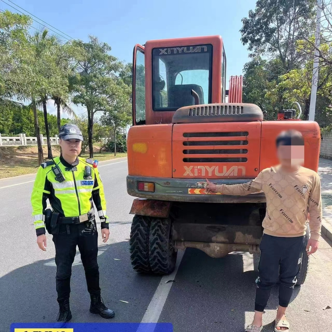 2024年1月10月11时41分,陵水公安交警执勤民警在旅游公路路段对过往车辆进行例行检查时,依法拦截下一辆无号牌轮式挖掘机。在对驾驶人身份及车辆信息进行进一步核查时发现,其还存在未取得驾驶证驾驶机动车的违法行为。对此,陵水公安交警对驾驶人邓某某无牌无证驾驶机动车上路的交通违法行为合并处以罚款1600元,并将车辆进行依法扣留。