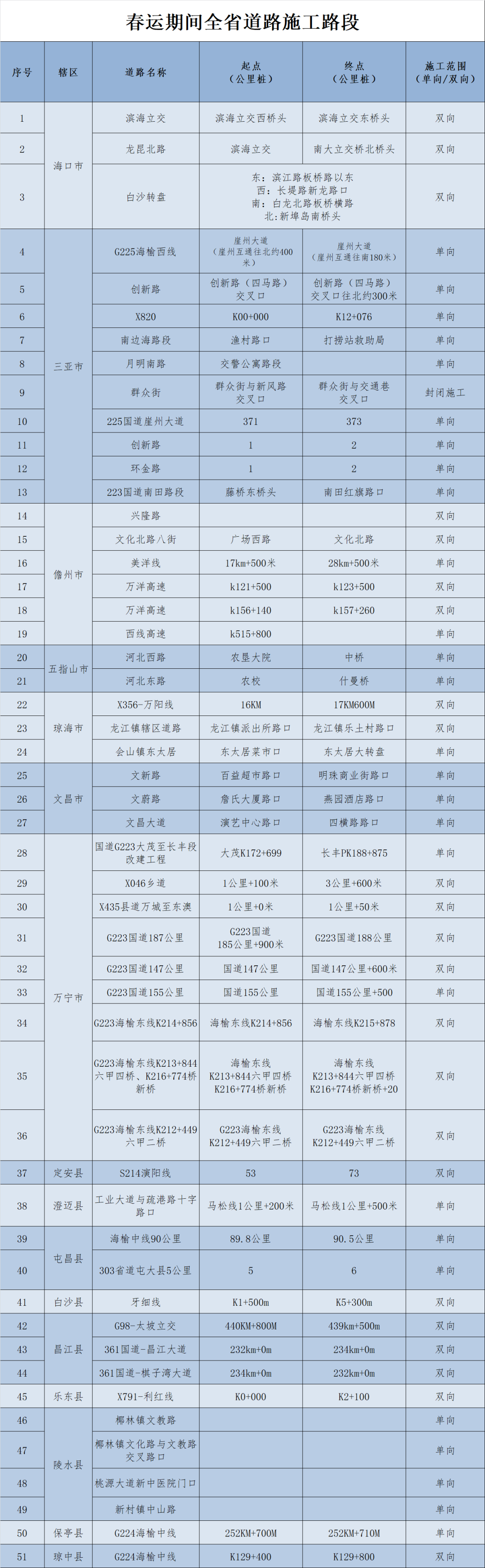 为服务群众春运期间出行,海南交警现向各位提示春运期间海南省道路施工路段。全省道路共有51处路段节点处于建设施工状态,沿线作业区已规范设置警示标志标牌等安全设施,途经车辆请提前做好出行规划。