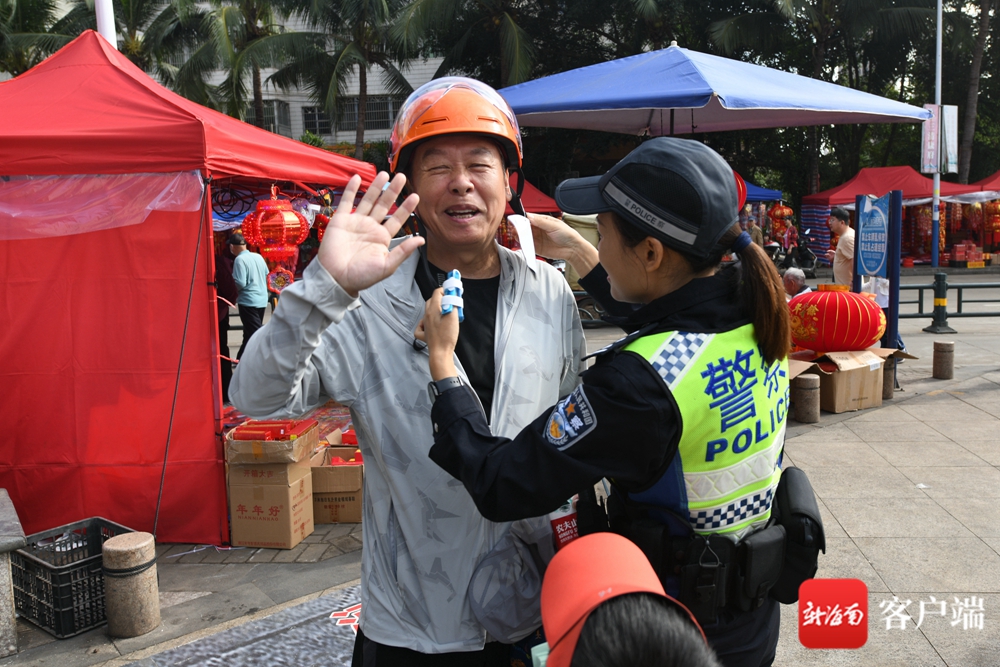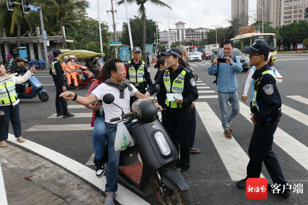 “阿叔,请戴好您的安全头盔再骑车,下次一定要记住了。”当天上午,在澄迈县老城镇洪都购物中心附近的十字路口,参加此次活动的一名澄迈女交警拦下一位骑电动自行车的老人,劝导其佩戴头盔,并发放交通安全宣传教育的材料。