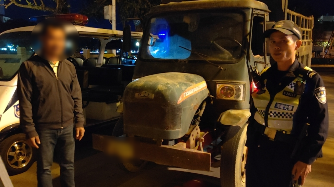 2024年1月27日,五指山交警在辖区河北西路开展今冬明春暨春运交通安全专项整治行动。20时50分许,执勤交警在对一辆车牌号为琼01-***66的拖拉机例行检查时,发现该车辆驾驶人疑似酒驾,便让其下车接受进一步检查。