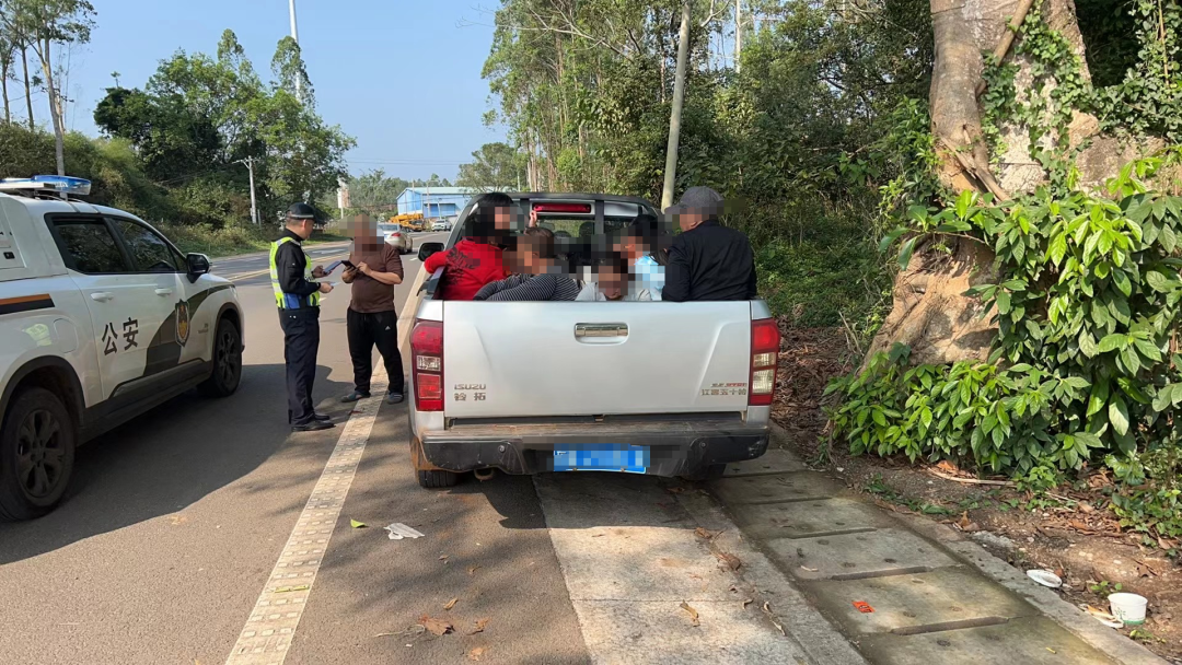 保亭公安交警开展路面整治时,发现道路上有一前一后行驶的两辆正三轮载货摩托车人头攒动,且没有任何保护措施,民警立即示意该车行驶至安全区域接受检查。