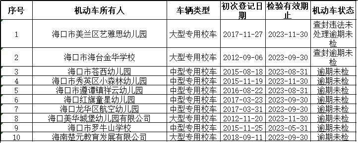 新海南客户端、南海网2月22日消息(记者 王燕珍)新的学期即将开启,搭载各位“神兽”的校车也准备出发啦。为进一步加强校车安全管理工作,严防涉校车道路交通事故的发生,2月22日,海口公安交警对以下逾期未检验校车予以曝光,请相关车辆管理单位、个人对所属车辆加强管理,依法检验。