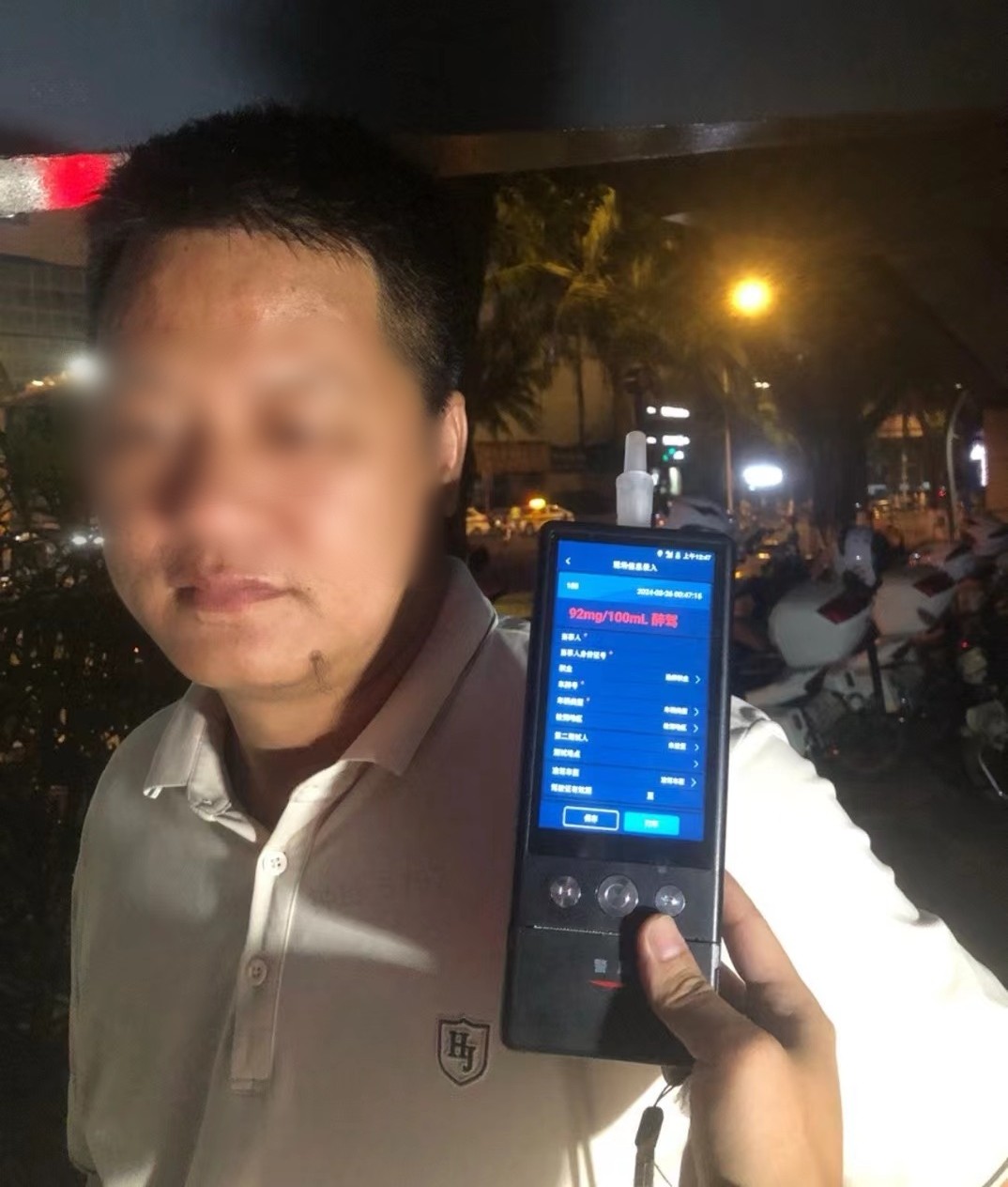 呼气式酒精检测值: 92mg/100ml