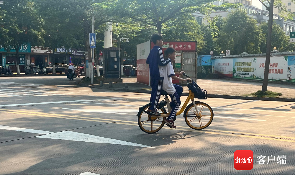 在友谊路上,一名穿深蓝色校服的学生骑着共享单车,而后坐上站着另一名学生,他们不走斑马线,横穿马路。