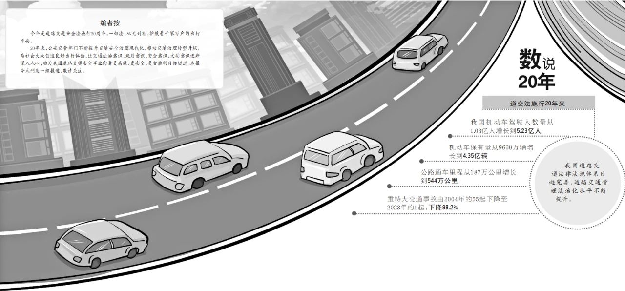 我国道路交通安全法(以下简称道交法)自2004年5月1日起施行,迄今已20年。20年来,我国机动车驾驶人数量从1.03亿人增长到5.23亿人,机动车保有量从9600万辆增长到4.35亿辆,公路通车里程从187万公里增长到544万公里,重特大交通事故由2004年的55起下降至2023年的1起,下降98.2%。