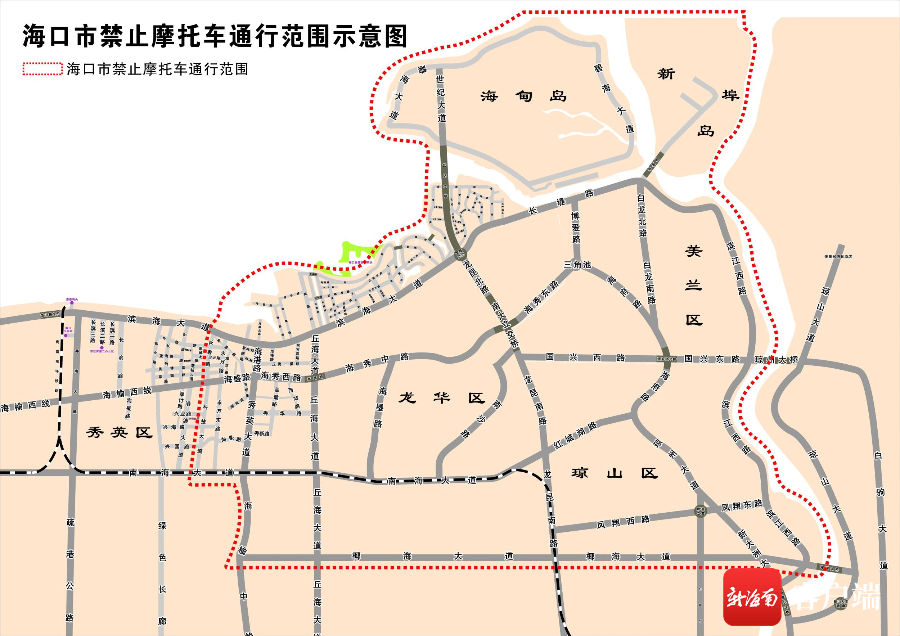 海口市城区禁止摩托车通行范围:以白驹大道与琼山大道交叉路口、椰海大道与滨江西路交叉路口、新大洲大道与椰海大道交叉路口、S81公路与椰海大道匝道口、龙昆南延长线与椰海大道交叉路口、椰海大道与学院路交叉路口、椰海大道与丘海大道交叉口、椰海大道与海榆中线交叉路口、海榆中线与南海大道交叉路口、南海大道与科技大道交叉路口、科技大道与海盛路交叉路口、海盛路与长秀路交叉口、长秀路与滨海大道交叉口(往北延伸至海岸线)为分界的连线,与海口市北侧海岸沿线和东侧南渡江沿线(含海甸岛、新埠岛)形成的闭合区域内的所有道路。