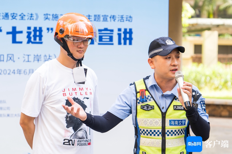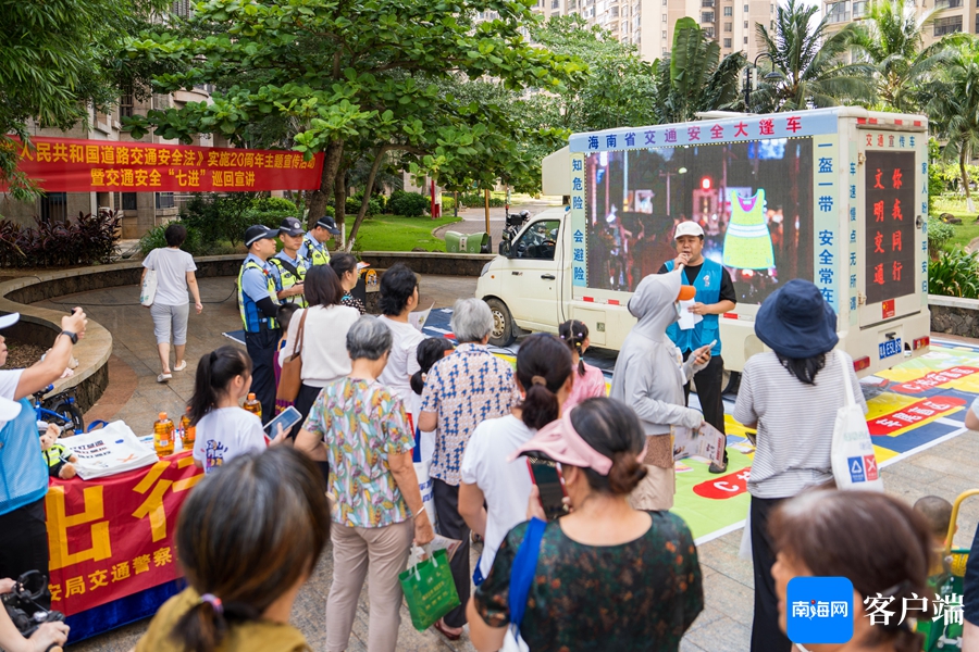据海南省公安厅交警总队有关负责人表示,2024年是我国道路交通安全法公布施行20周年,为大力弘扬文明交通理念,增强广大人民群众的文明意识、法治意识、安全意识,海南交警以交通安全“七进”宣传为载体,通过走进企业、农村、社区、学校等开展交通安全宣传活动,营造良好的社会宣传氛围。