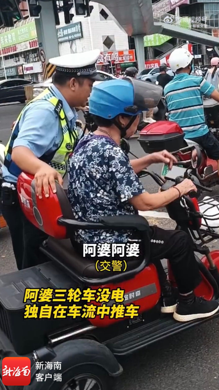8月19日晚高峰时段,海口公安交警黄润畅在和平天桥执勤时,发现一位七旬阿婆正艰难地推着电动三轮车在车流中缓慢前行。经询问得知,阿婆的电动车在回家途中突然没电,只能徒手推行。