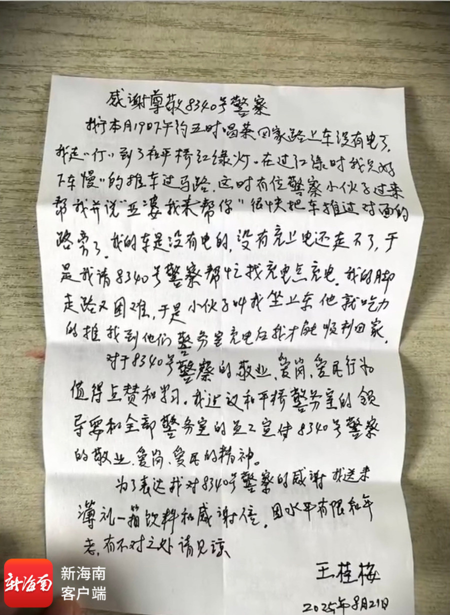 白发苍苍的七旬老人推着没电的三轮车艰难在海口街头前行,这时一名警号为8340的交警上前,主动帮阿婆推车、充电,一句“警察不就是帮助你们的吗”,也深深温暖了老人的心田。近日,受助老人王阿婆亲手书写一封感谢信,送给帮助她的海口公安交警。