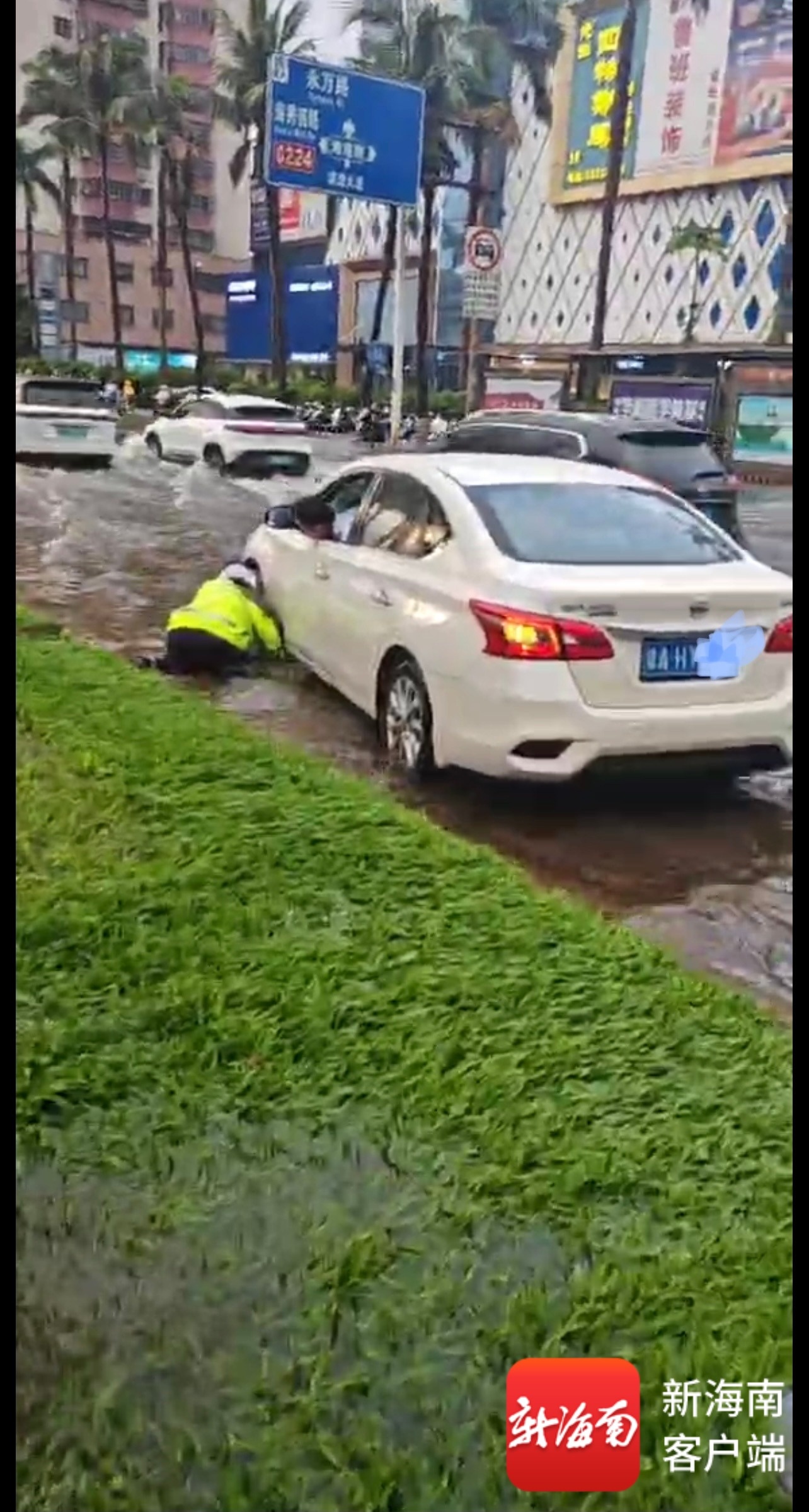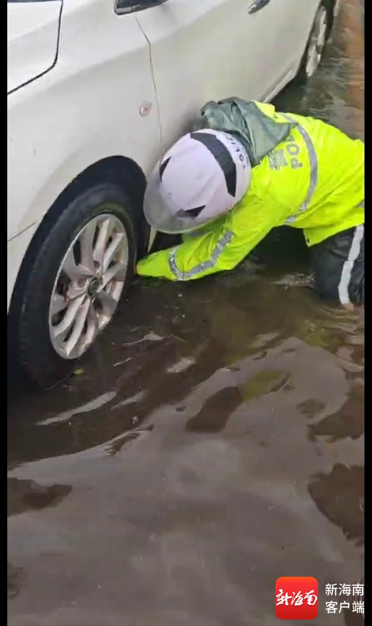 车辆被困积水中无法前行司机求助 海口交警趴在水中徒手排障
