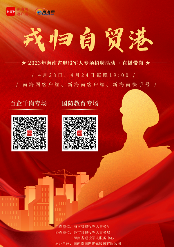 新海南客户端、南海网、南国都市报4月21日消息(记者 潘頔)为进一步做好退役军人就业工作,推进退役军人高质量就业,由海南省退役军人事务厅主办,各市县退役军人事务局、海南省退役军人服务中心协办,南海网承办的“戎归自贸港”2023年海南省退役军人专场招聘活动近日启动,活动分为线上直播带岗、线下招聘会两部分,将推出百家企业上千岗位。