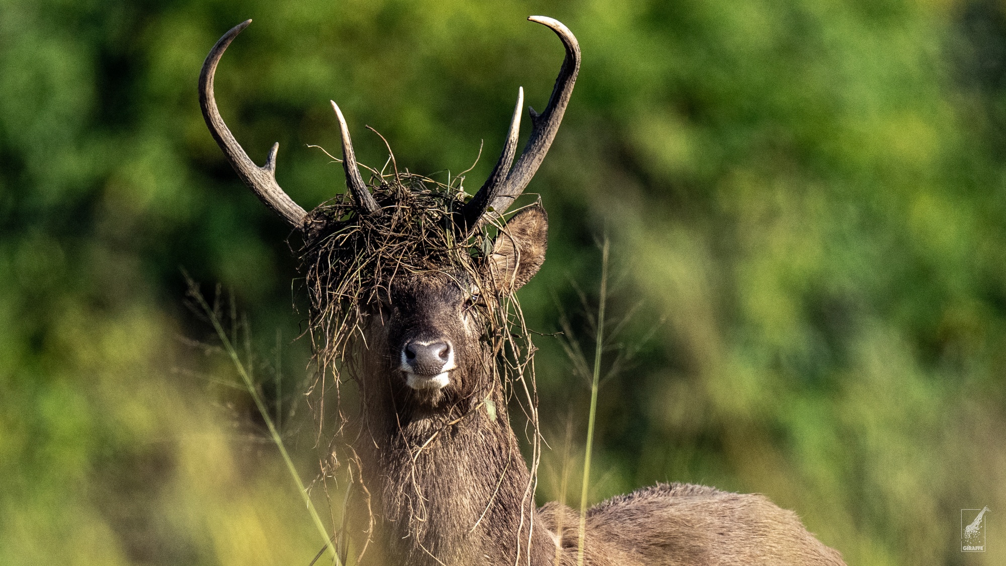 雄鹿头上一对漂亮的鹿角,其角形比较独特,角的主干与眉枝从角基部呈钝角分开,眉枝向前伸出,再稍向前上方弯曲。主干先向后伸长,再向上向前弯曲,呈弯弓型。整个角型私英文字母“C”,主干基本不分枝。